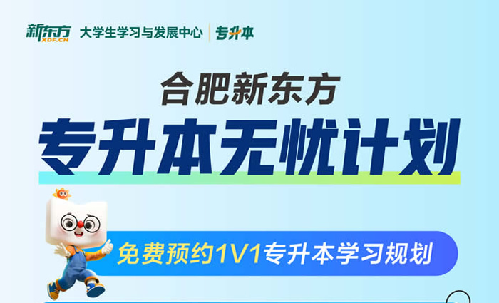 合肥新方考研专升本无忧计划提供,如课程培训、课后练习、学习规划、全程答疑、全程监测、复试指导等,专人监督,专人管理,专属讲义,院校信息,升本资料,学习计划,较为靠谱,升本伙伴一起奋战,升本路上不孤单!还不知道安徽统招专升本考试报名如何进行,院校如何选择,发愁占不到自习室的专科生,一定要来合肥新东方专升本校区了解下哦!