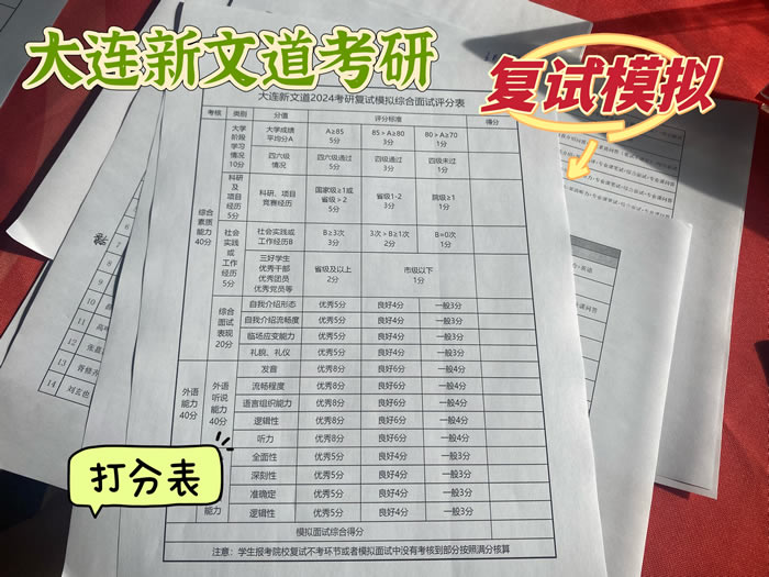 大连新文道考研复试课程班培训结合各专业复试考核要求与历年考情,通过针对性指导与模拟演练,帮助学员提升复试综合能力,适配不同院校复试考核标准。目标院校复试规则、考核形式、评分标准分析。